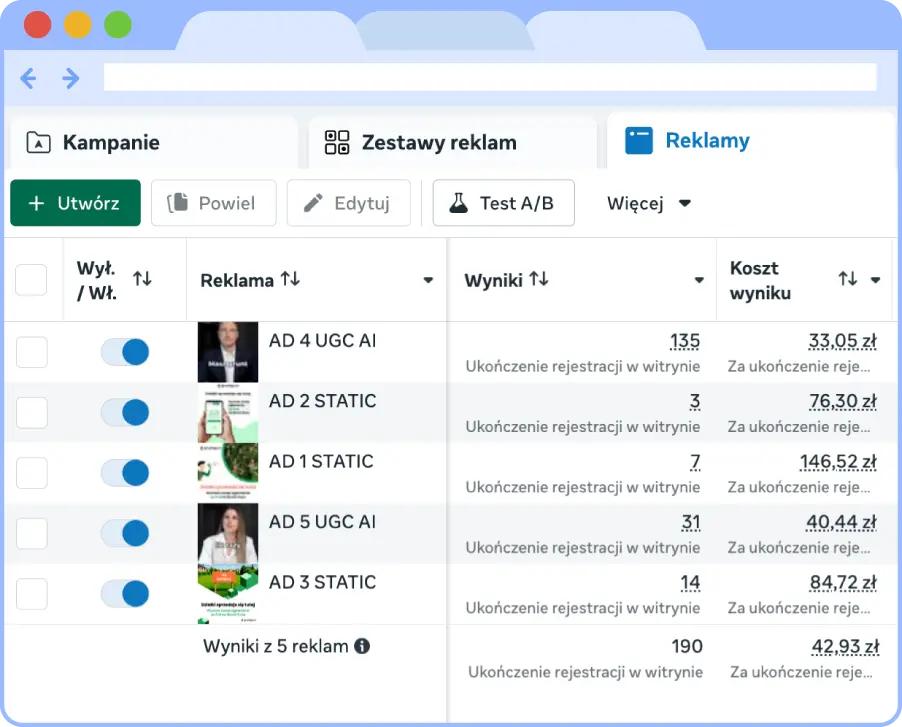 Po wdrożeniu kreacji AI UGC analizowałem wyniki poszczególnych wariantów - najlepiej działające kreacje skalowałem, a słabsze zastępowałem nowymi iteracjami. Dane z kampanii napędzały produkcję kolejnych materiałów.