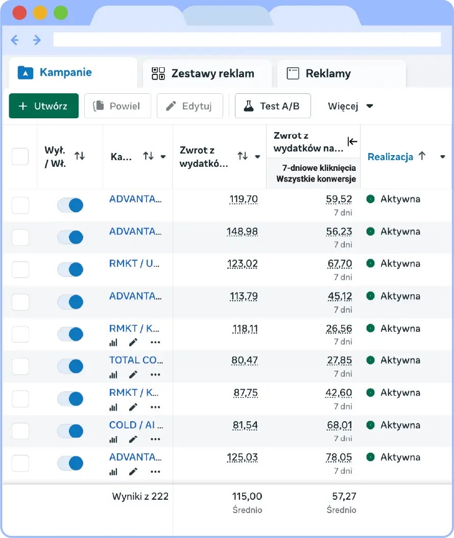 Codzienna kontrola kampanii Meta Ads - zarządzanie budżetem, analiza, optymalizacja, skalowanie najlepszych kampanii. Kampanie zoptymalizowane pod sprzedaż z naciskiem na ROAS i realny przychód sklepu.